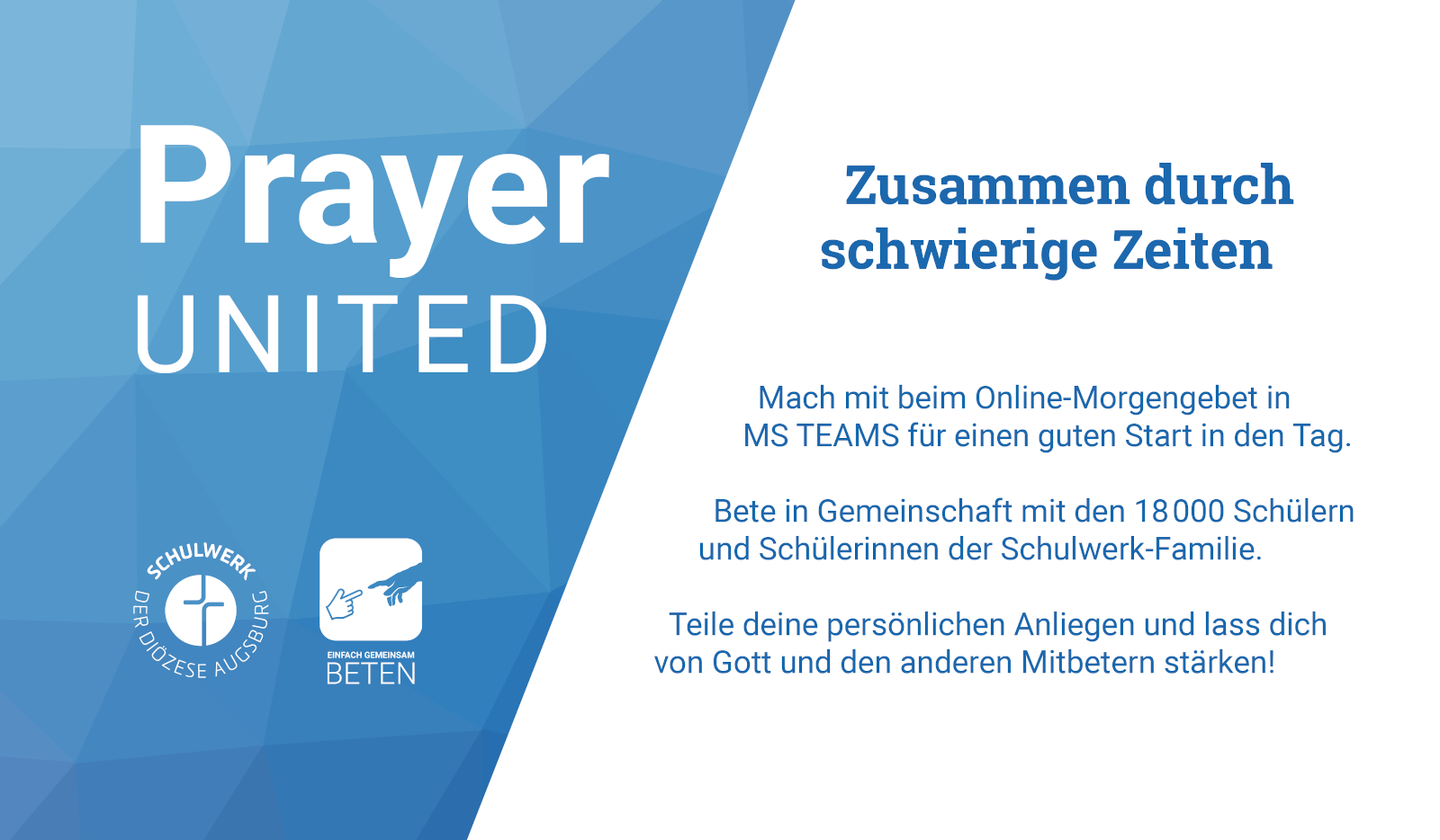 Auf der Seite https://www.schulwerk-augsburg.de/schulpastoral-corona/ erfahren Sie mehr zum Thema Schulpastoral in Zeiten von Corona. Dort können Sie z.B. ein Tutorial zum Thema „PRAYER UNITED – zusammen durch die Krise“ abrufen, sehen das Morgengebet der Hl. Mirjam von Abellin und erhalten bis 03.04.2020 jeden Tag einen sog. Morgenimpuls unseres ernannten Bischofs Bertram. Dazu gibt es weitere Angebote des Bischöflichen Jugendamtes.