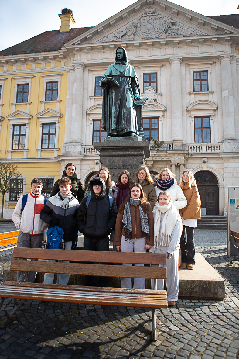 Am zweiten Tag der Exkursion ging es nach Dillingen, dem zweiten Rom, an die ehemalige Jesuitenuniversität, wo die Gruppe nicht nur den Goldenen Saal, sondern auch die ehemalige Universitätsbibliothek auf eigene Faust erforschen konnte. Das Ziel des Projektes bestand darin, den vermeintlichen Gegensatz zwischen dem Glauben und dem Wissen auszuloten. Die am Ende gestaltete Litfaß-Säule belegt, dass hierin kein Widerspruch gesehen werden muss.