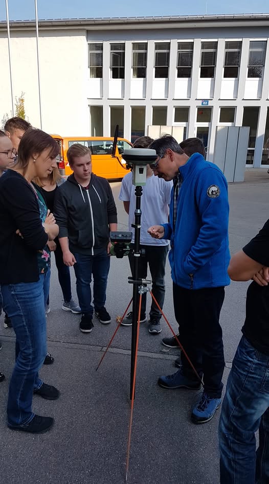 Herr Eberle drückte seine Freude und seinen Stolz über den Messpunkt auf dem Schulgelände aus und sprach den Schülern des Seminars, das sich für dieses Projekt verantwortlich zeigte, sein Lob aus. Ebenfalls lobenswerte Worte fand im Anschluss Peter Lauber. Er erklärte, wie ein Referenzpunkt eingemessen wird und warum es neben unzähligen inoffiziellen Referenzpunkte auch diese Offiziellen gibt. Der Landkreis Günzburg hebt sich durch diesen Punkt in Wettenhausen nun deutlich von der Masse ab: Er ist der einzige Landkreis, der nun zwei offizielle Bezugspunkte vorweisen kann – einen im Hofgarten Günzburg, der zweite eben am STG.