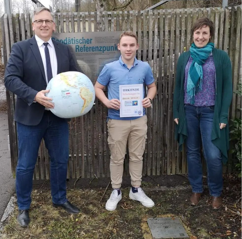 Kurz vor den Faschingsferien konnten Frau Abt, die Fachleiterin Geographie, und Schulleiter Andreas Eberle, im „Nebenberuf“ auch Geographielehrer, unserem Schulsieger im „Diercke WISSEN 2022 – Der Geographiewettbewerb“ gratulieren.