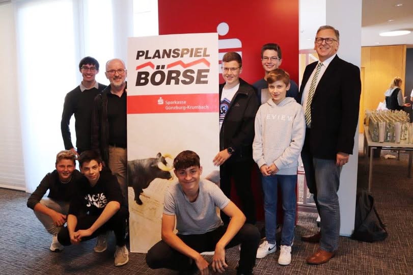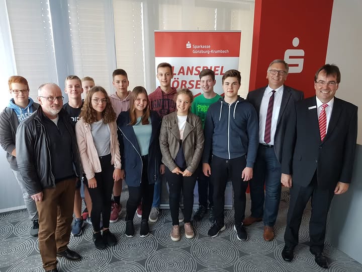 so Uwe Leukert, Vorstand der Sparkasse Günzburg-Krumbach, gestern bei der Auftaktveranstaltung zum diesjährigen „Planspiel Börse“ in Günzburg. Das Bild zeigt neben Herrn Jürgen Iwan von der Sparkasse, Herrn Robert Neukam als betreuendem Lehrer und Schulleiter Andreas Eberle einen Teil unserer teilnehmenden Schülerinnen und Schüler.