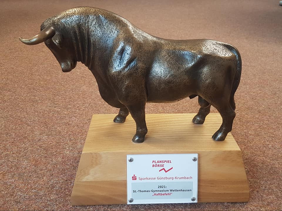 Der „Börsenbulle“, der Wanderpokal des „Planspiel Börse“ der Sparkasse Günzburg-Krumbach, steht für ein Jahr am STG. › mehr