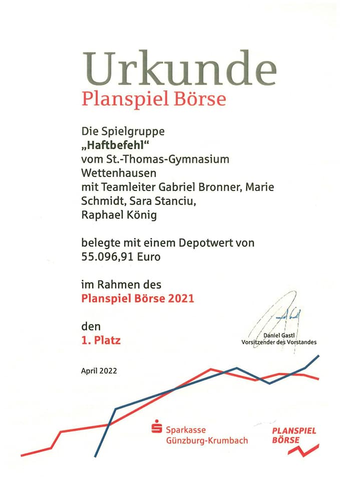 Unsere Spielgruppe „Haftbefehl“ errang den 1. Preis und der Vorstandsvorsitzende Daniel Gastl von der Sparkasse ließ es sich nicht nehmen, Urkunde und Bulle persönlich ans St.-Thomas-Gymnasium zu bringen und zu gratulieren.