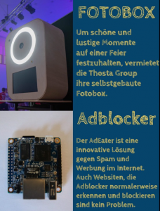 Das Schülerunternehmen bietet in seinem Online-Shop folgende Produkte an: Die verleihbare Fotobox ermöglicht, Fotos vor allem von Veranstaltungen mobil und bequem von dieser sehr ansprechend gestalteten Box herunterzuladen. Die andere Innovation ist der sogenannte AdEater. Dieses Programm wird direkt an den WLAN-Router angeschlossen und blockiert somit auch Webseiten, die normale Adblocker erkennen und umgehen können. Somit wird das gesamte Heimnetzwerk geschützt.